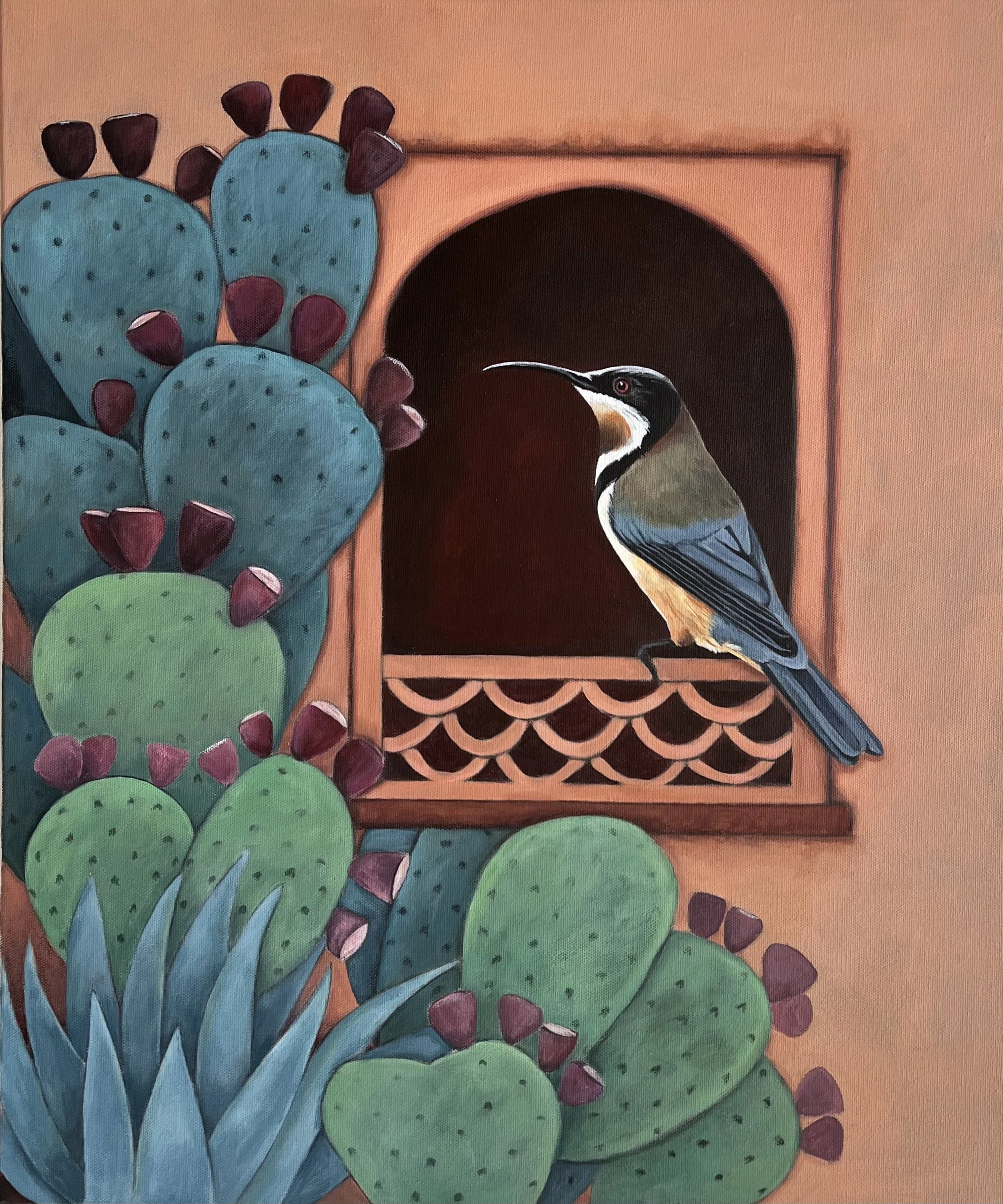 Slide 1 Slide 1 (current slide) Eastern Spinebill with Prickly PearsAcrylic on canvas50 x 61cmAUD $830