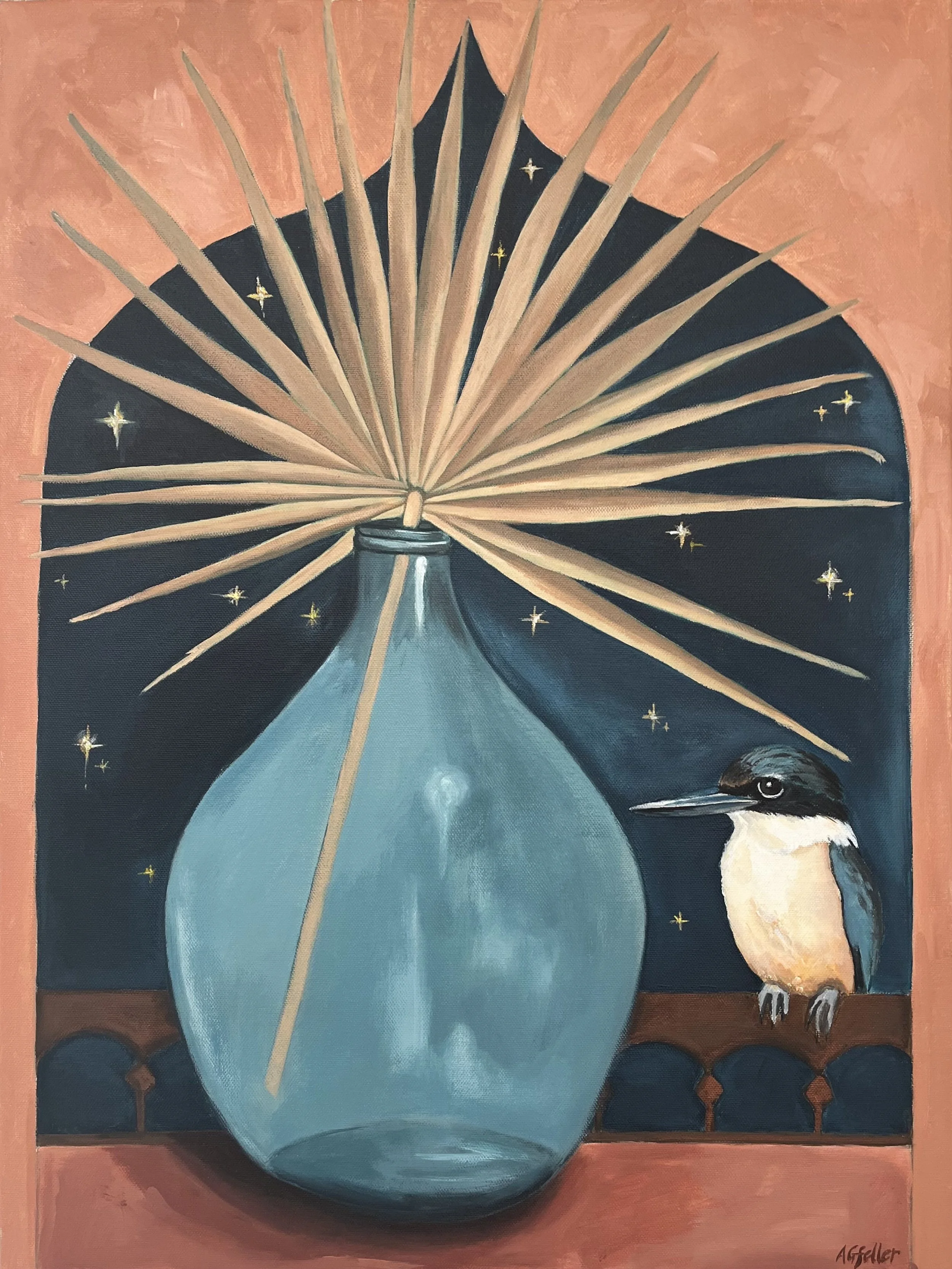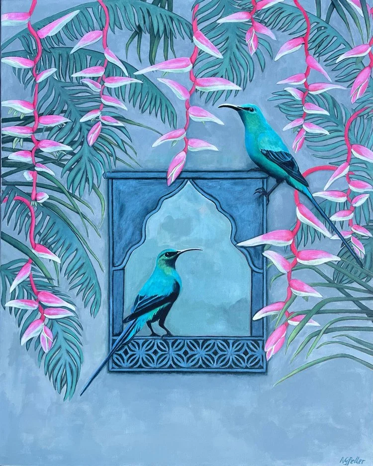 Sacred Kingfisher with palms & heliconia